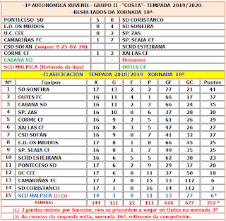 Salvo o partido CSD Sofán-SCRD Esteirana, que quedou aprazado até o 25-02-20, os resultados e clasificacións da citada xornada, foron os que a continuación se detallan: